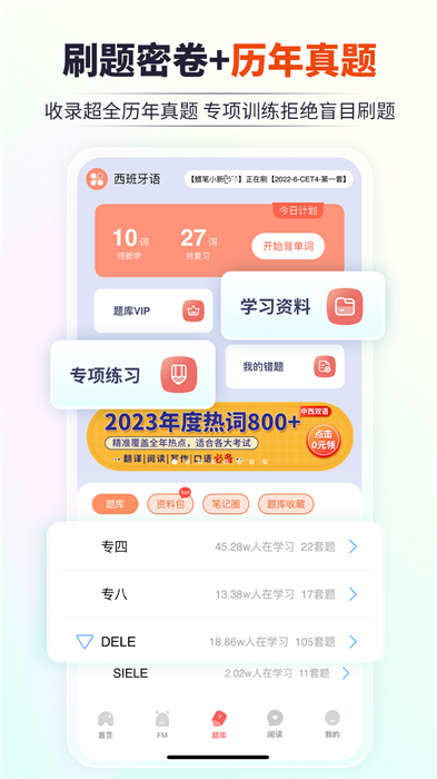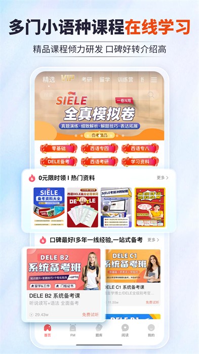 课程内容上涵盖零基础学习、各类考试考证辅导、真题练习及多语种外刊和分级阅读等。