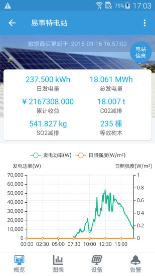 能监控光伏电站的移动端软件,为用户提供光伏电站的实时监控数据、历史监控数据、电站设备告警等一系列电站监控数据,协助用户更方便快捷的管理光伏电站及设备。