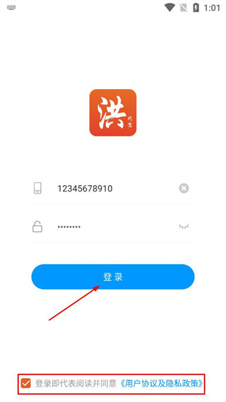 2、确认账号密码填写无误后,勾选登录即代表阅读并同意相关条款的选项。