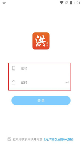 1、打开洪师傅代驾,进入登录界面,在账号输入框填写对应的账号信息,再填写密码。
