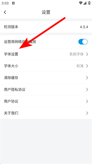 3、在设置界面,点击字体设置选项,进入字体选择的页面。