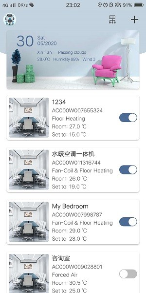 根据房间分类所有设备,展示卖个房间正在运营的设备,和温度的状态,方便用户快速的找到对应的设备;