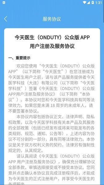 今天医生(ONDUTY)APP(公众版)是今天医学科技(大连)有限公司旗下的面向大众的个人端产品。