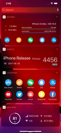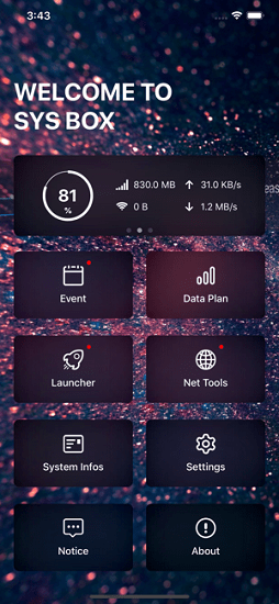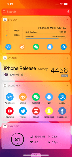 SYS BOX是针对苹果手机的通知栏小组件,软件拥有监控网络流量,查看网络使用情况的功能,在这里你还可以将应用的图标添加进来,可以直接通过组件进入,方便快捷,而且你还能够自定义图标,让你的手机桌面炫酷无比,如果你想要让自己的手机桌面变得与众不同,那就快来试试这个软件吧!
