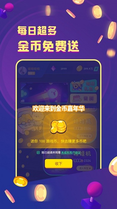 金币嘉年华是一款可以让你随时随地享受无限乐趣的抓娃娃游戏,金币嘉年华游戏不仅有身临其境的线上抓娃娃场景,还有超炫的口红机。积分商店各种好物等你来兑换,奖品我们统统给你包邮到家!轻松带走娃娃!