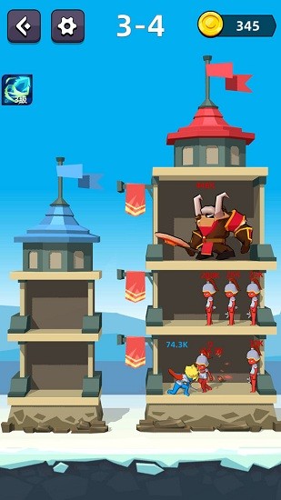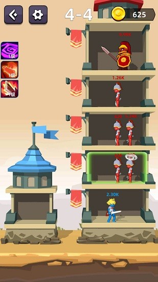左边的蓝色城堡是我方阵营,右边的红色城堡代表的是敌方阵营,每一关卡分为四个小关卡,逐个通过每个小关卡才算挑战成功哦。 骑士和敌人头上的数字即当前的血量,点击我方骑士,移动到对应的敌人面前,即可战斗,只有血量大的才能在战斗中获胜哦。 技能在小关卡里是逐渐积累的,选择合适的技能可以让你的获胜几率更大哟~ 快来挑战吧~打败最终的大boss,赢得胜利吧~