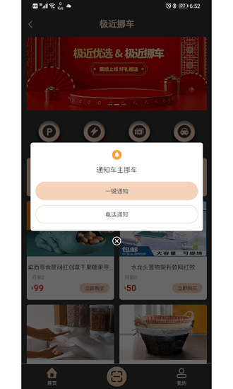 1、在这里,不仅可以通过软件进行快速挪车。还可以在平台中进行各种小物件的购买