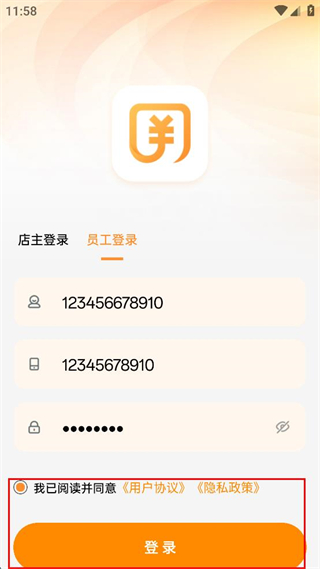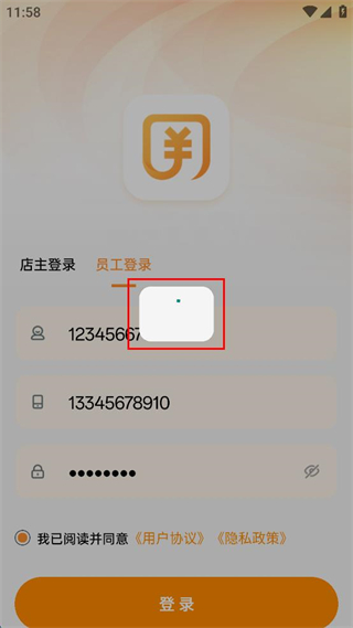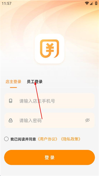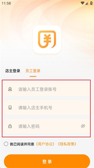 2、在员工登录界面输入员工登录账号、店主手机号和密码。