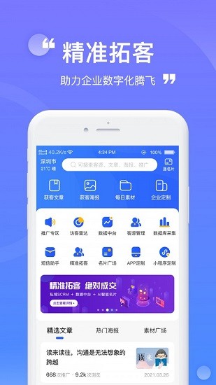 高效智能营销系统软件,安装在手机上的一个具有海量客户资源的APP,真正助你实现一人抵传统营销数十人的营销力量。