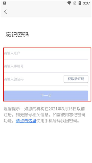 2、进入忘记密码页面后,填写账户、手机号并获取验证码,点击下一步。