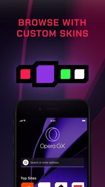Opera GX的独特设计灵感来源于游戏和游戏装备,与赢得桌面Gx浏览器红点和IF设计奖的风格相同。从定制主题中选择,如GX经典、紫外线、紫色薄雾和白狼。