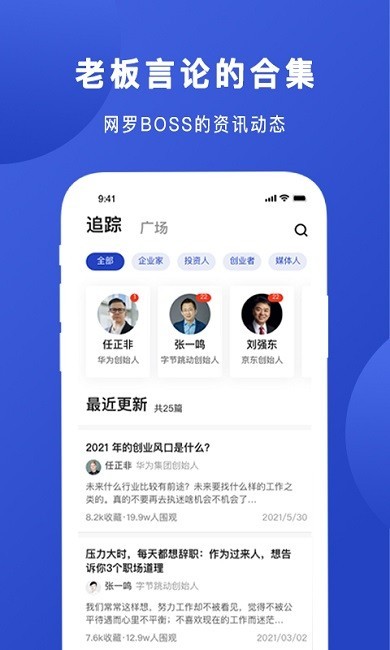 收录各领域企业家 / 投资人 / 创业者 / 媒体人 / 专业大牛等国内外老板的文章或言论,系统了解boss思想和境界,深度学习。