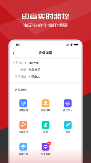 1、设备监控:实时监控设备的电量、设备内印章等状态信息,并可控制设备进行更换印章、蘸墨等操作。