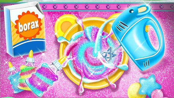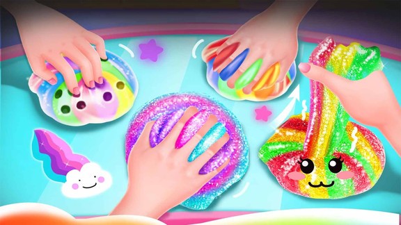 到商场去购买制作史莱姆需要的原材料,选择您喜欢的闪闪发光的可爱的蓬松粘液!就可以开始制作啦:取一个碗,加入胶水,水,泡沫,面粉和彩虹色的颜料。然后用双手不断的制作摩擦和拉伸。在彩虹独角兽制作完成之后,通过伸展,碾压和手指戳压来玩耍美丽的独角兽果冻玩具。