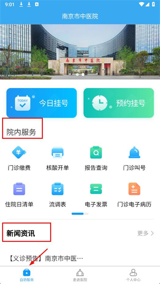 1、在自助服务页面,提供今日挂号、预约挂号服务,设有院内服务板块,还能查看新闻资讯,了解医院义诊预告等动态。