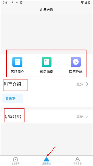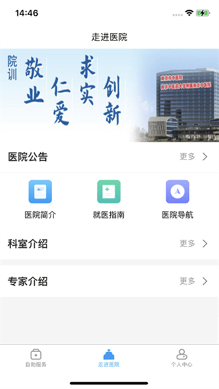 2、点击底部导航栏走进医院,可以查看医院简介、就医指南、医院导航,还能了解科室介绍和专家介绍,方便患者熟悉医院情况。