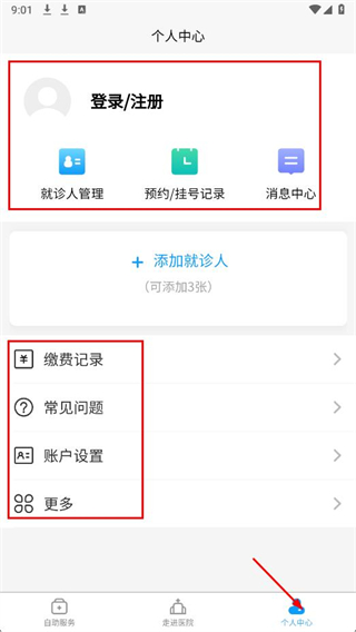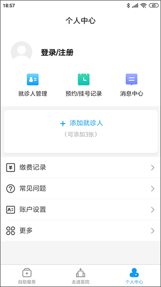 3、在个人中心,支持登录/注册,可进行就诊人管理、查看预约/挂号记录和消息中心,还能查看缴费记录,获取常见问题解答,进行账户设置等。