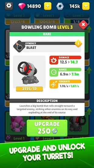 2、游戏的各种塔防都是可以升级的,玩家可以把闯关获得的奖励用来升级,提高自己的实力。