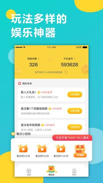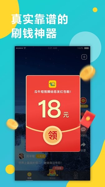 瓜牛短视频版是一款短视频分享、看视频赚现金的APP。海量精彩视频,边看边赚钱,提现0套路,免审核秒到账,天天领现金。更有超值的用户专享活动,参与即可瓜分千万现金大奖,好玩多赚,抢金币赚现金!