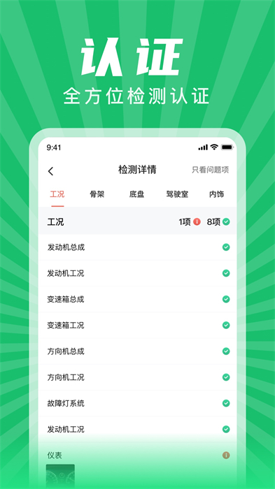 1、通过二手商用车标准的检测体系,107项专业检测标准,为您提供专业的二手商用车技术检测认证报告。