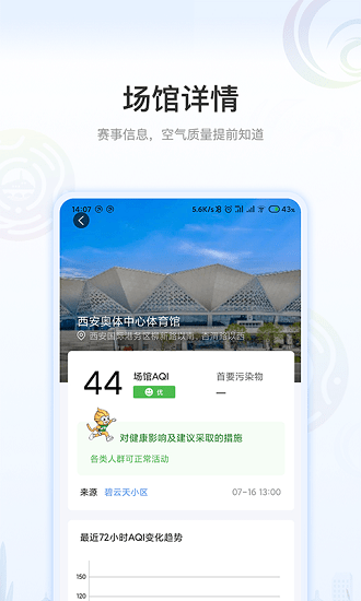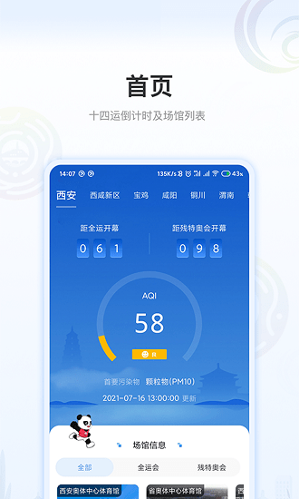 绿色全运是针对陕西举办的2021年第十四届全国运动会、第十一届残运会暨第八届特奥会所开发的一款查看地区场馆赛事项目及周边天气、大气环境监测的APP。