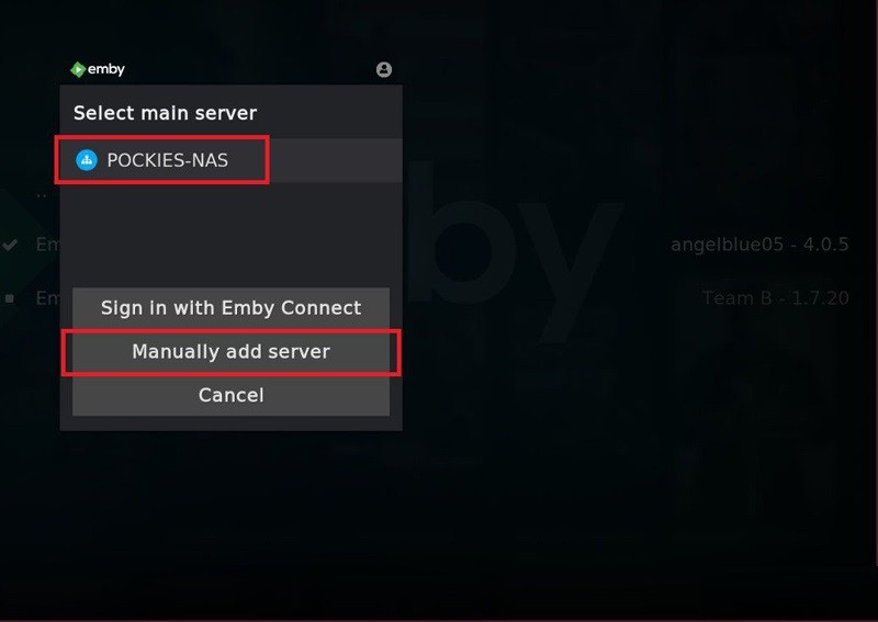安装完毕会弹出配置对话框,一般会自动扫描到局域网的Emby服务端,比如我的NAS。如果没有则点击Manually add server手动输入您的服务端ip与端口(默认8096),填入公网DDNS地址可在外播放家里的电影哦。