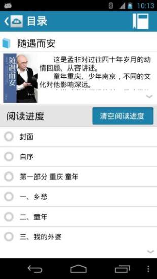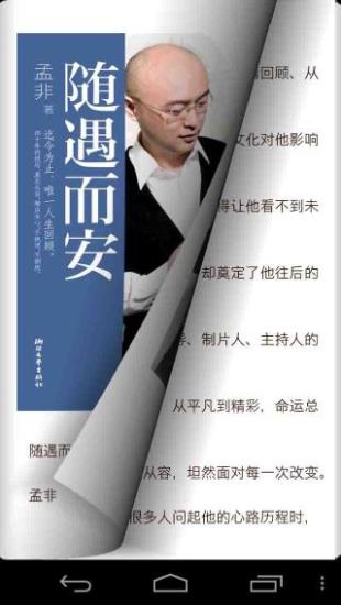 随遇而安是一款专门对孟非自传作品阅读的应用,在这里你将不需要去耗费金钱买书籍,耗费流量在线阅读,现在此应用为你搜集海量传记让你体验阅读的乐趣,欢迎下载!