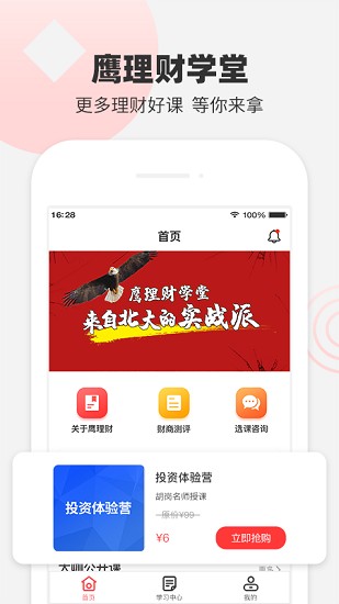 鹰理财学堂app给想学习理财的朋友带来非常全面且方便的理财学堂软件,丰富的功能不仅有便捷的操作方式更有海量优质课程选择以及专业名师在线知道,实时提问以及各种优质期货理财方案选择等等应有尽有,软件功能多多上手容易等你来加入。需要的朋友赶紧来下载吧。