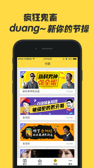 更有疯狂专题每日新推荐,如“新科男神张全蛋”,“用了金坷垃,日本资源不缺乏”,各种鬼畜恶搞视频,让你爆笑不停!