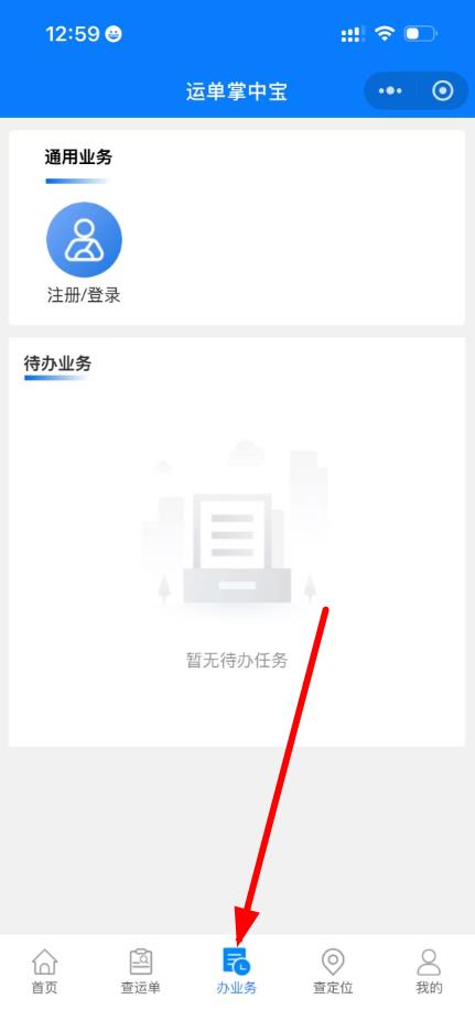 2、若未注册登录,返回首页,点击底部导航栏中的办业务选项,在通用业务板块里点击注册/登录,完成注册或登录操作。