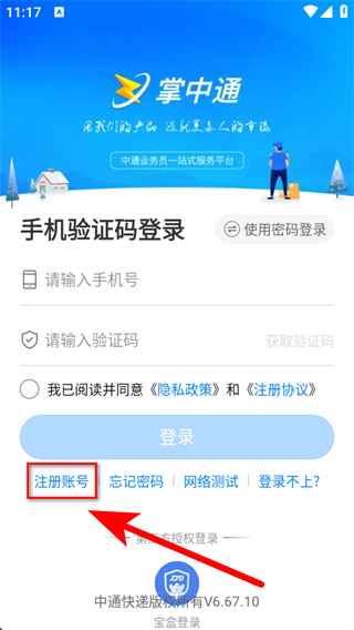 1、打开掌中通APP,我们需要在登录界面点击注册账号。