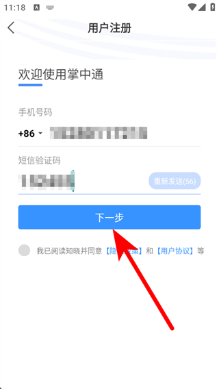 2、进入用户注册页面,输入手机号,点击发送验证码并输入。