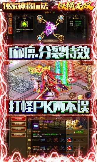 《纵横无双-免费充值版》是一款主打单职业特色的BT传奇手游,游戏福利超高;全新打金地图,小怪元宝爆一地,BOSS狂暴钻石,充值卡,每日千万钻石等你来抢;顶级装备BOSS全可爆,千元真充值卡签到就送,包你不花钱,花小钱也能玩得爽;切割神器免费解锁,BOSS刀刀到肉;独家神将麻痹、分裂特技,神戒破甲,晕眩效果,神兵强力道法技能等你来探索;这是一个值得你尝试的船新版本
