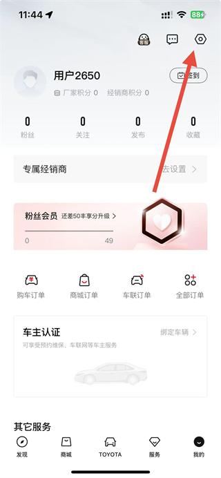 2、在我的页面,点击右上角的设置图标,进入设置操作界面。