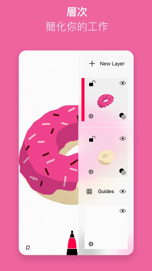 无需任何按钮。 在您创作时,工具始终保持隐藏,以避免分散您的注意力。 可进行缩放和平移,方便您描绘最小的细节和以惊人的准确度选择颜色。