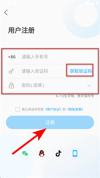 4、在注册页面,输入手机号等信息后,点击注册完成账号注册操作。
