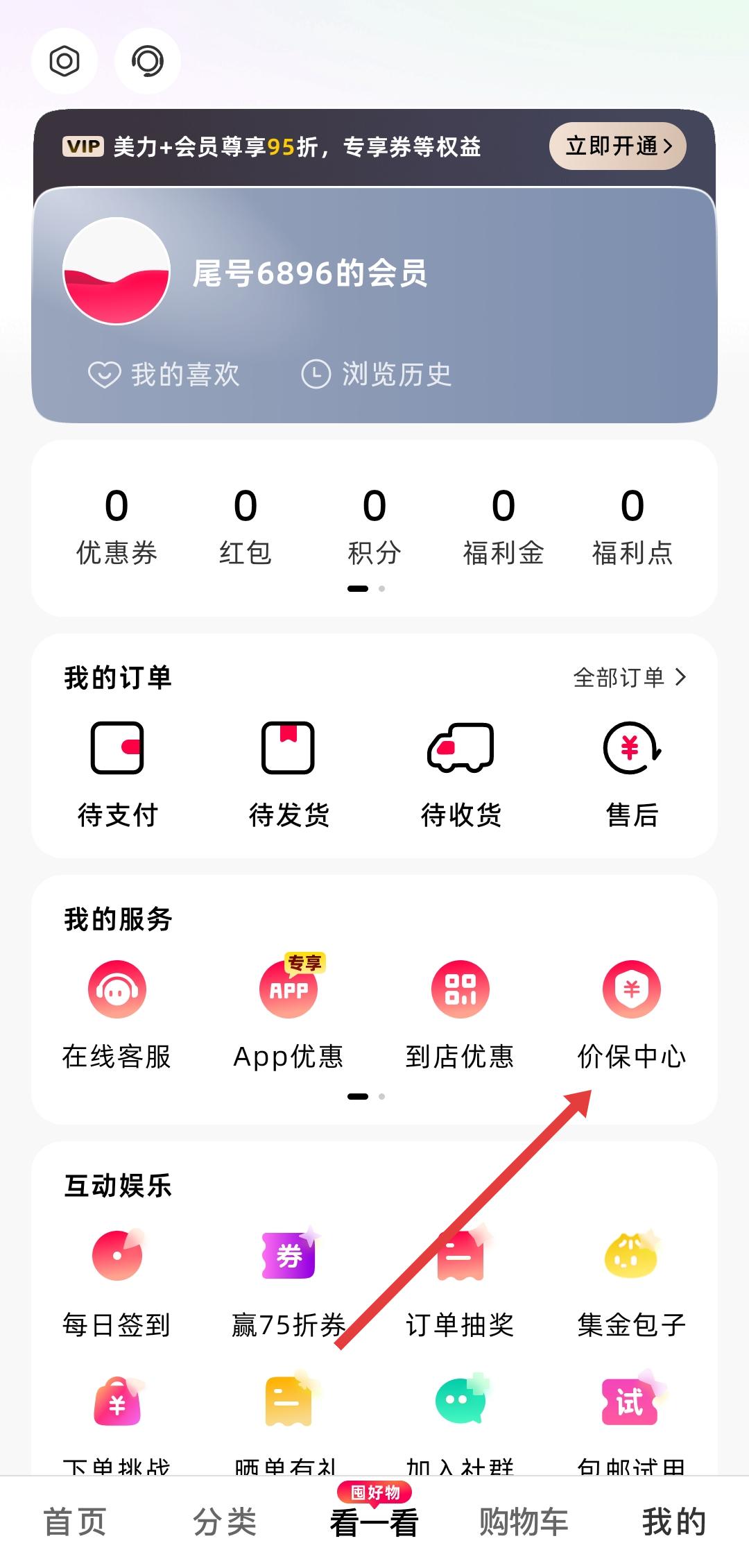 2、在我的页面,需要点击价保中心的选项,进入保价服务的界面。
