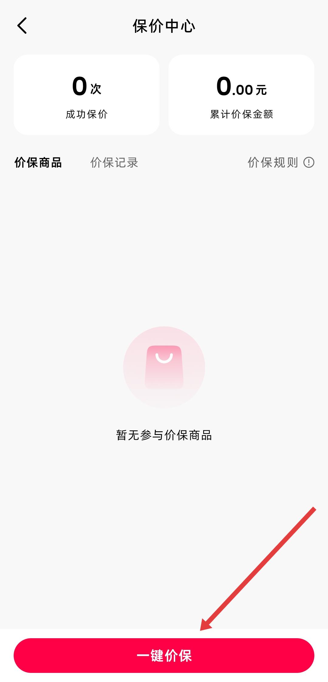 3、在保价中心页面,点击底部一键价保按钮,触发系统查询价保商品。