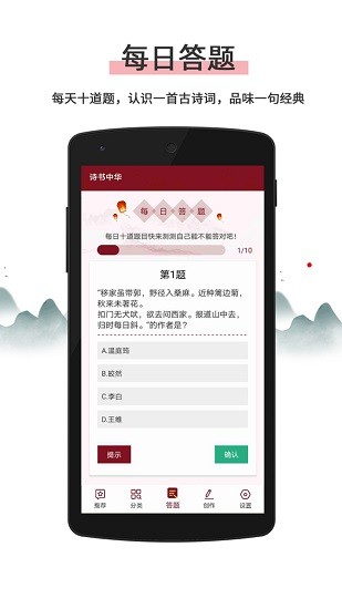 诗书中华是一款关于中华古诗词文化的app,精选经典的传统古诗词,历朝历代文明的经典作品诗词应有尽有,每首诗词还有详细介绍,所有你想要的内容,这里都能找到。每天系统都会为你随机的推荐一首古诗让你学习,人性化的设计模式,丰富的查询条件供你使用,让你可以更好的快速搜索需要的资源进行学习。