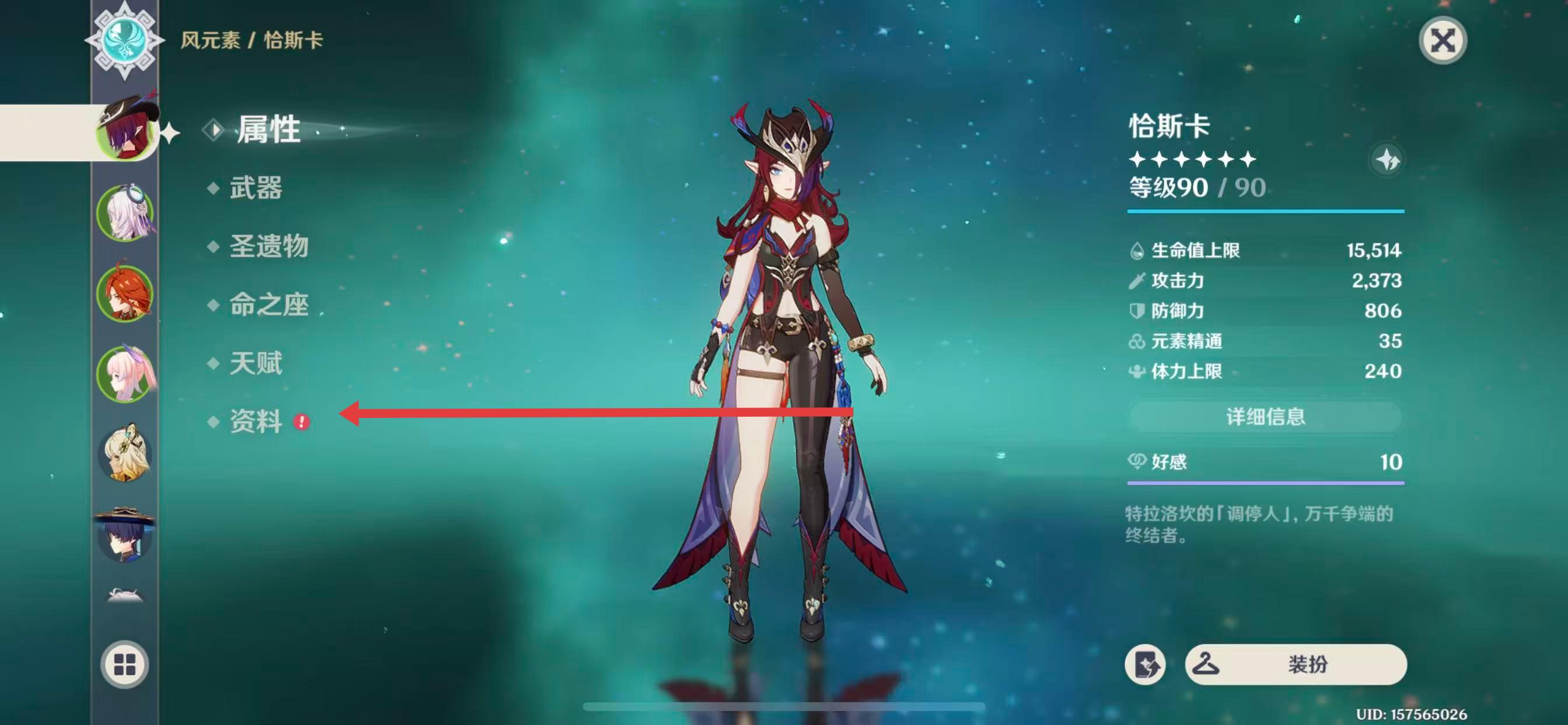 2、进入所选角色的界面后,点击左侧列表中的资料选项。
