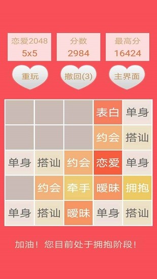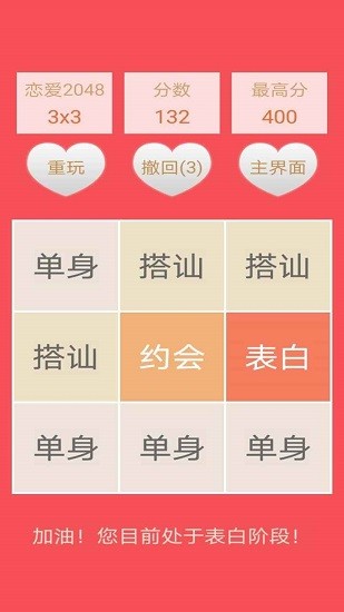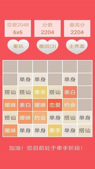 2048恋爱版游戏能够看到恋爱的顺序,从单身到搭讪,从暧昧到恋人,这是一款2048小游戏,却也能教会你恋爱的顺序,在游戏中选择自己想玩的游戏难度,在游戏开始之后还可以撤回三次哦,来这里看看自己能够走到哪一步呢。
