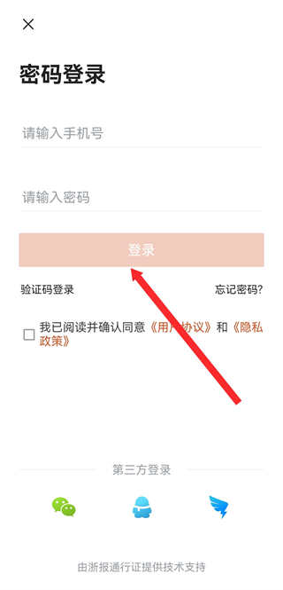 4、在密码登录界面,输入手机号和密码后,点击登录完成密码登录。