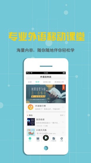 外语随身听,外语学习的移动课堂。外语随身听app涵盖英语,法语,韩语,日语,德语,俄语,意大利语,西班牙语等多热门语言。还有有从小学到托福的各阶段英语学习素材,解放双眼,无需书本,轻松拥有全程英语辅导。