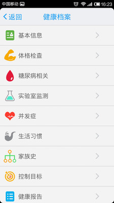 健康档案:全方位的健康档案数据,体格检查、糖尿病相关、实验室相关、并发症、生活习惯、控制目标等等,只为更好的为您服务。