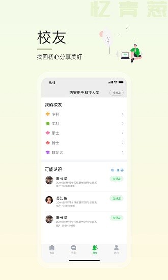 忆青葱是一款社交聊天类型的app,用户在这款忆青葱app里面可以快速的帮助你找到大学时期的校友,带给你的互动体验更加的丰富,同时你也能在这交友互动,让你能够认识更多的人一起玩,并且还可以获取到很多的校友资源,实用性很强。