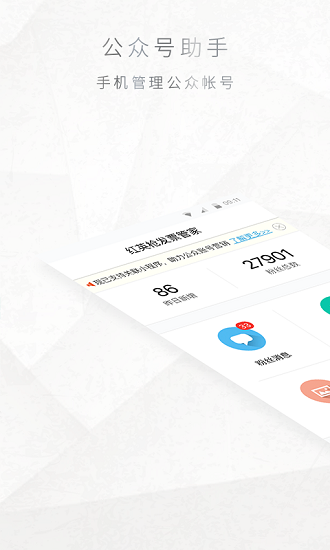 公众号编辑助手,是公众平台手机版,直接手机管理公众帐号(订阅号和服务号),随时随地管理粉丝消息、群发图文信息,实现公众号运营者与粉丝之间的实时互动,帮助线上微商公众号推广和自媒体互粉,更好更快营销。还可以绑定小程序运营,达到互动交易两不误。
