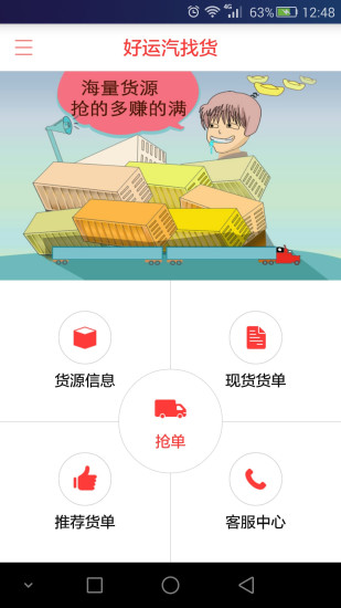 好运汽找货是一款生活服务类手机软件,这里每天有海量货源推送,有美女给你播报最新抢单信息,让你轻松找到好货,告别空载,轻松赚钱,快乐生活,喜爱的朋友赶快下载体验吧!