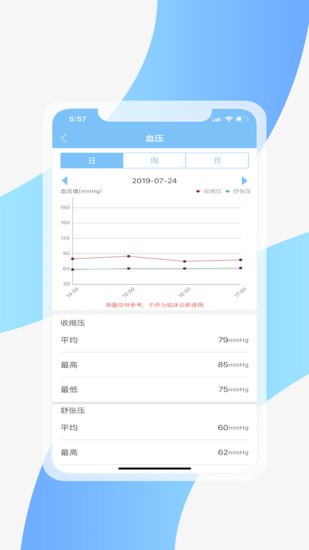 图形化为用户呈现每日、周、月的健康数据,各种心率数据、血压数据等数据信息;