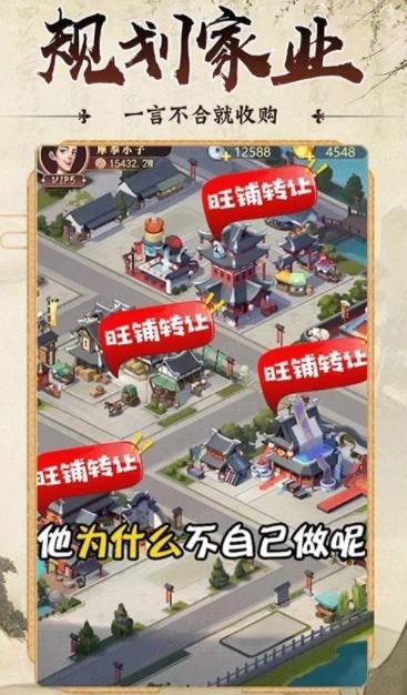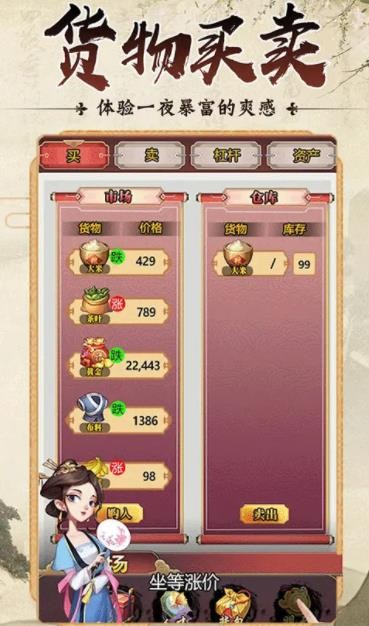休闲模拟游戏,游戏画风幽美,玩家将穿越古代,踏上商贾之路,积累更多的财富,不管是做生意还是养六畜,可以培养不同的门客和伙计。