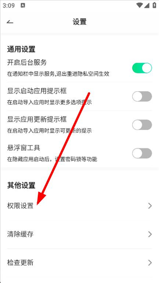 2、进入设置页面后,找到并点击下方的权限设置选项。